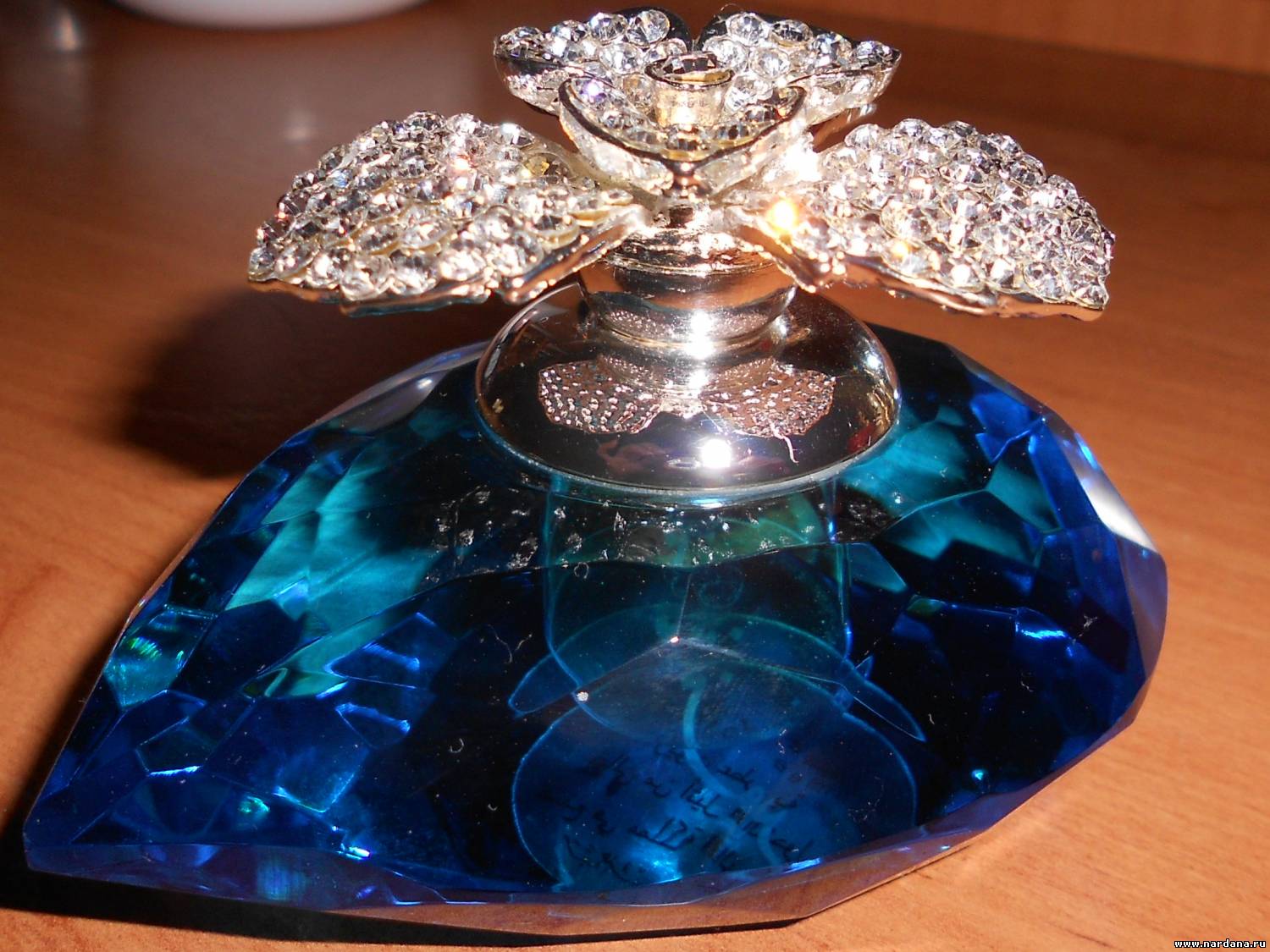 Такое шикарное голубое сердце из стекла,а крышечка-цветок в стразах-глаз не отвести.Тоже таким обладаю,правда там миллик всего остался во флаконе.